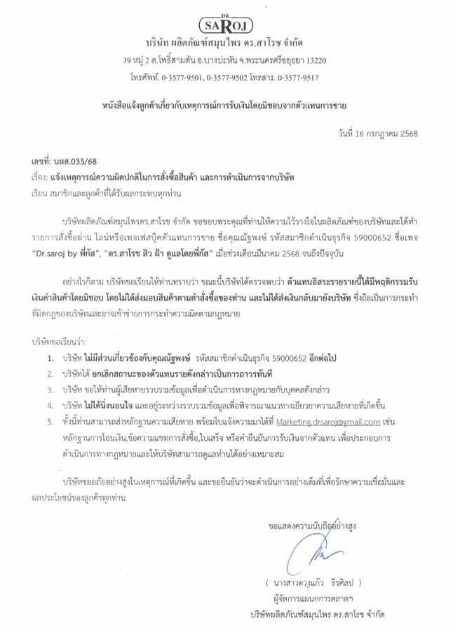 บริษัทผลิตภัณฑ์สมุนไพรดร.สาโรช จำกัด ขอขอบพระคุณที่ท่านให้ความไว้วางใจในผลิตภัณฑ์ของบริษัทและได้ทำรายการสั่งซื้อผ่าน ไลน์หรือเพจเฟสบุ๊คตัวแทนการขาย...
