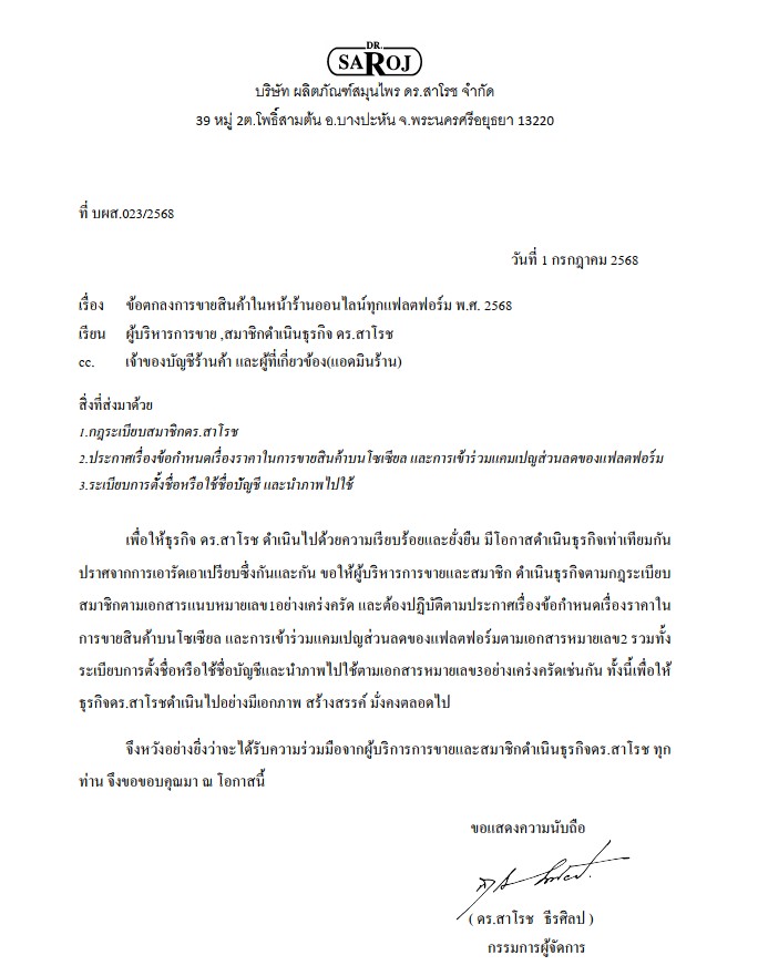 จึงหวังอย่างยิ่งว่าจะได้รับความร่วมมือจากผู้บริการการขายและสมาชิกดำเนินธุรกิจดร.สาโรช ทุกท่าน จึงขอขอบคุณมา ณ โอกาสนี้